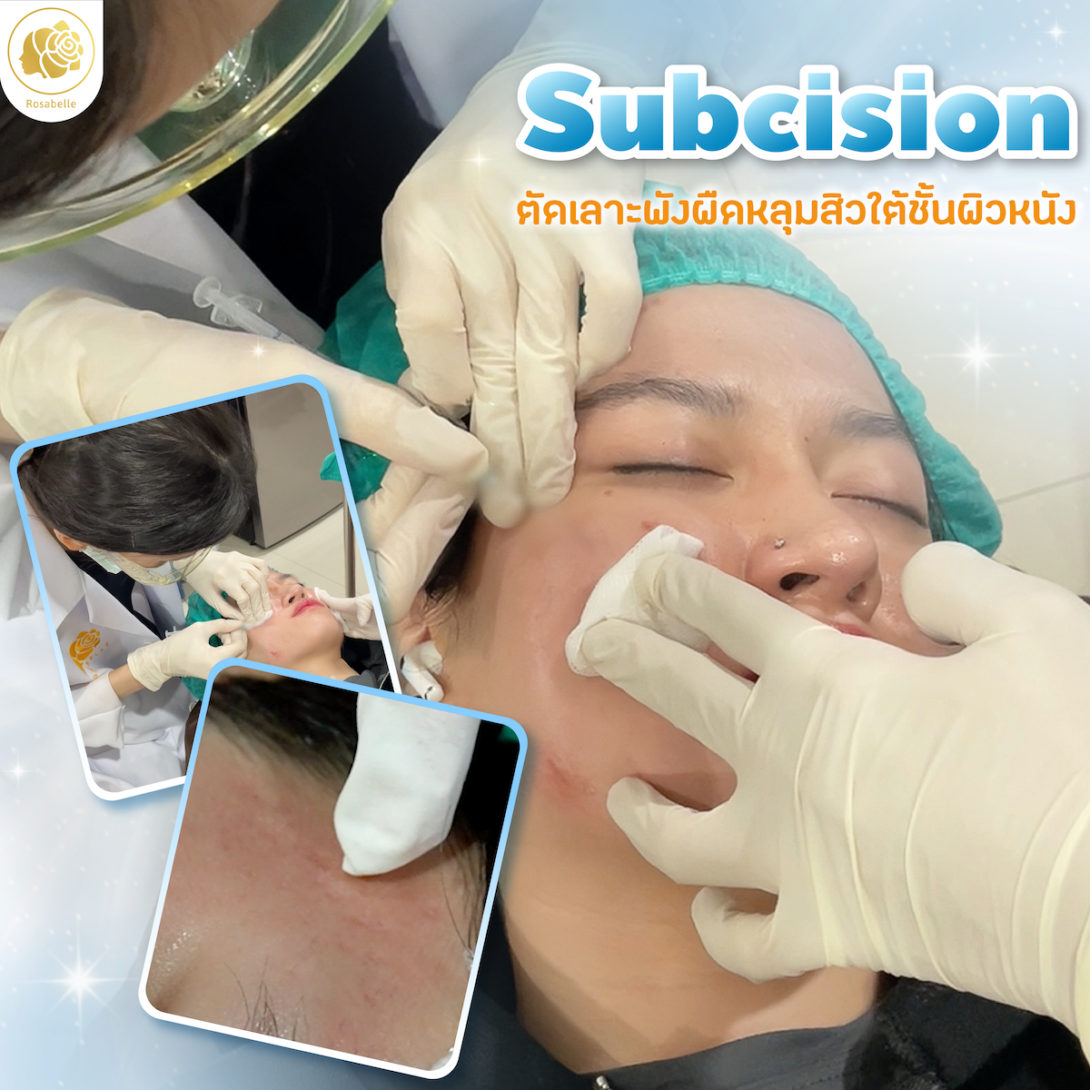Subcision คือ การใช้เข็มตัดพังผืดใต้หลุมสิวในชั้นใต้ผิวหนังที่ดึงรั้งผิวทำให้เป็นหลุมไว้ นอกจากนี้ยังช่วยกระตุ้นให้เกิดการสร้างคอลลาเจน และเกิดการสร้างผิวใหม่ จะเห็นผลว่าหลุมสิวตื้นขึ้นหลังจากทำไปประมาณ 1 เดือน เป็นหัตถการที่ต้องใช้แพทย์