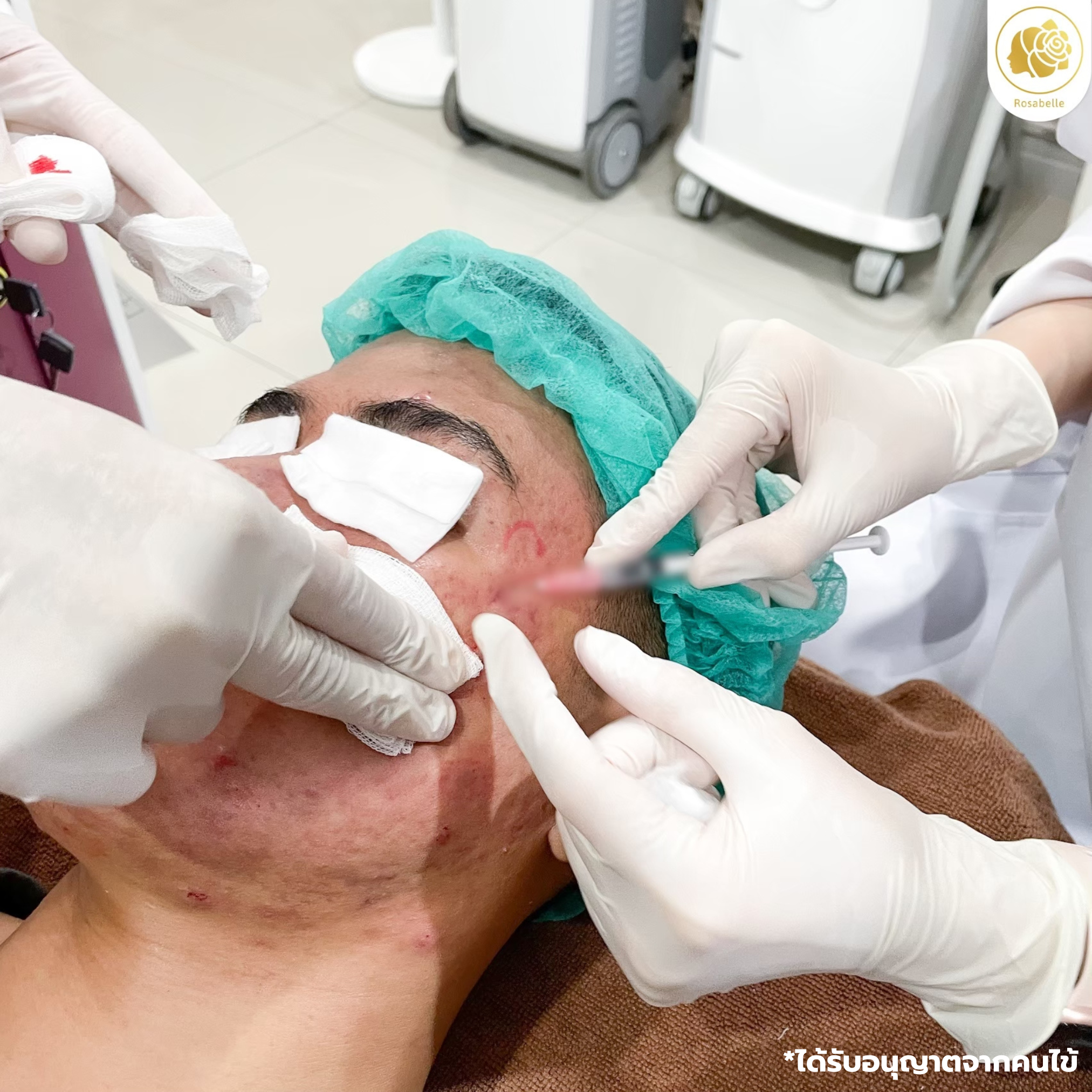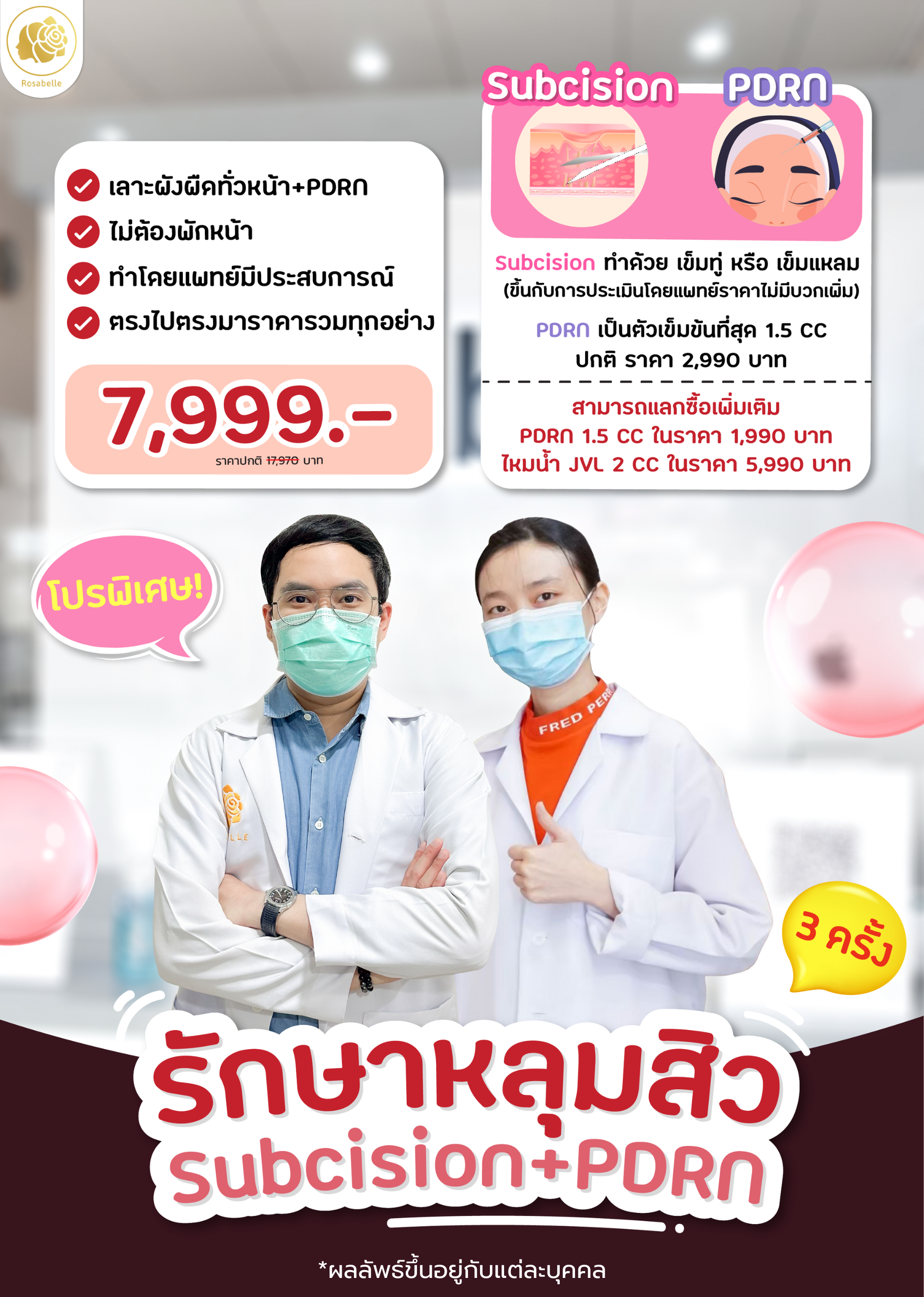 ปัจจุบันที่ Rosabelle Clinic มีคอร์สหลุมสิว Subcision 3 ครั้ง + PDRN 3 ครั้ง ราคา 7,999 บาท