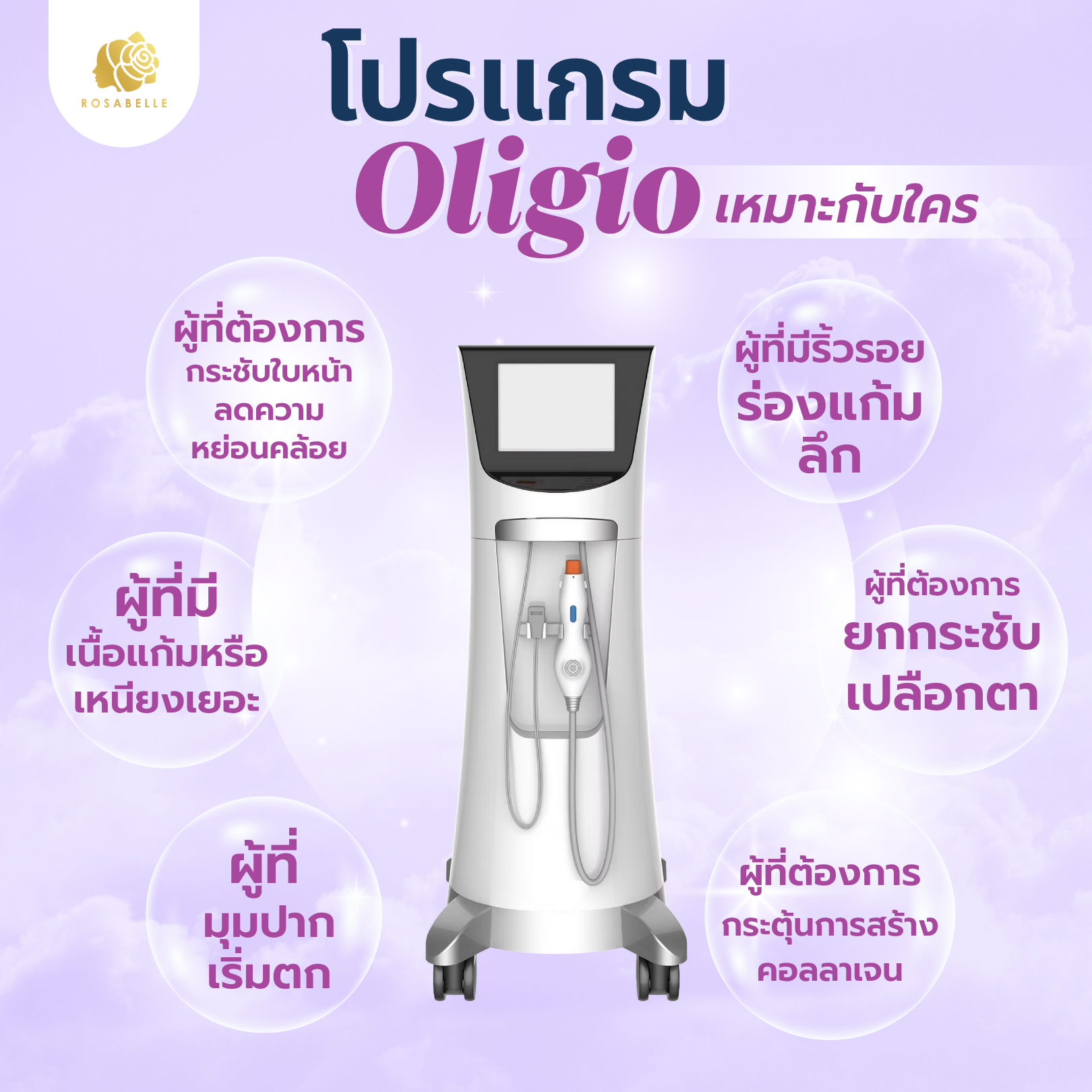 ผลลัพธ์ที่ได้คือ ผิวที่เคยหย่อนคล้อยจะถูกยกกระชับขึ้น ริ้วรอยต่างๆ แลดูจางลง ผิวมีความยืดหยุ่นและเรียบเนียนขึ้นอย่างเห็นได้ชัด นอกจากนี้ โปรแกรม Oligio ยังช่วยสลายไขมันส่วนเกินบริเวณแก้มและใต้คาง ทำให้กรอบหน้าดูคมชัดและได้รูปมากยิ่งขึ้น