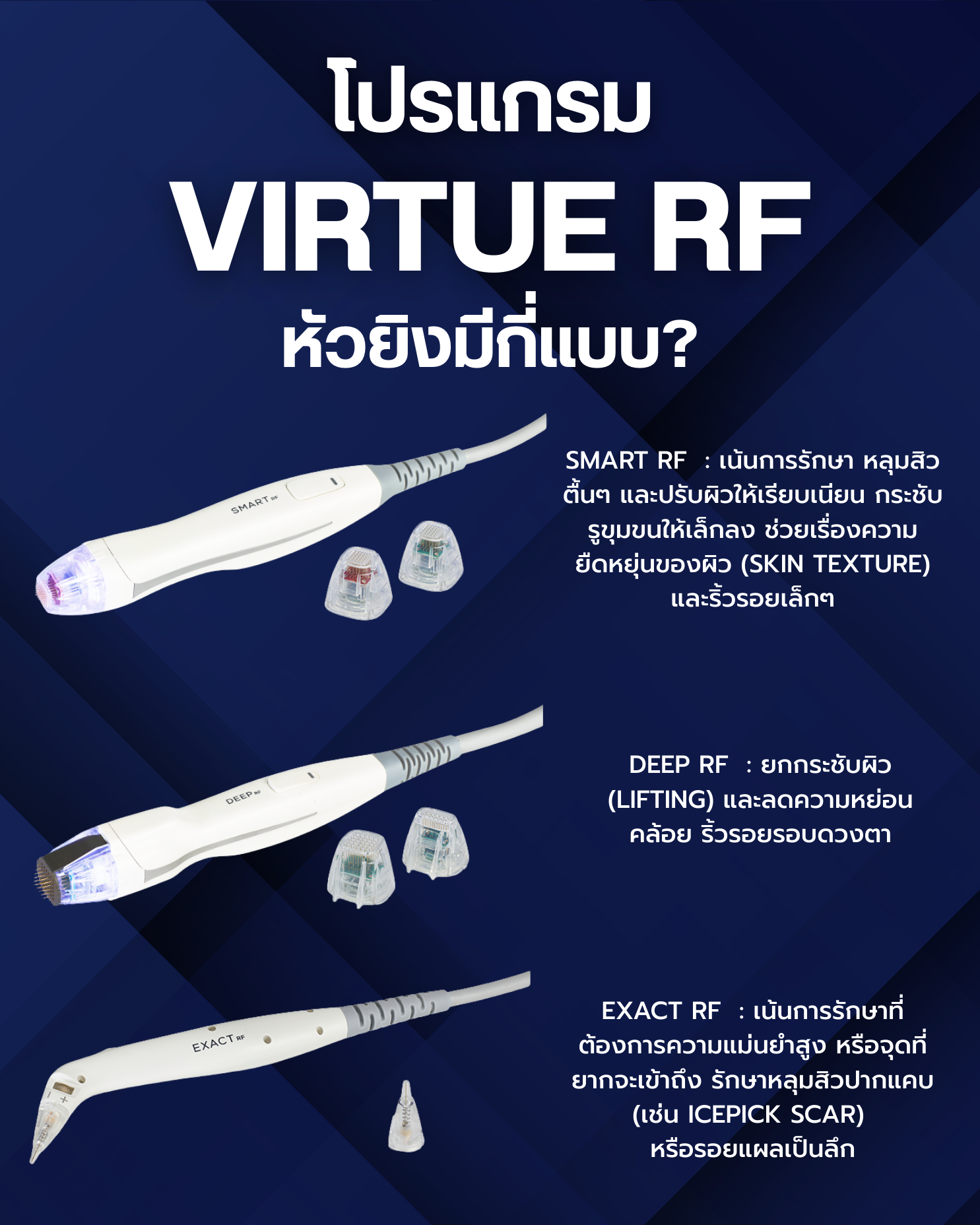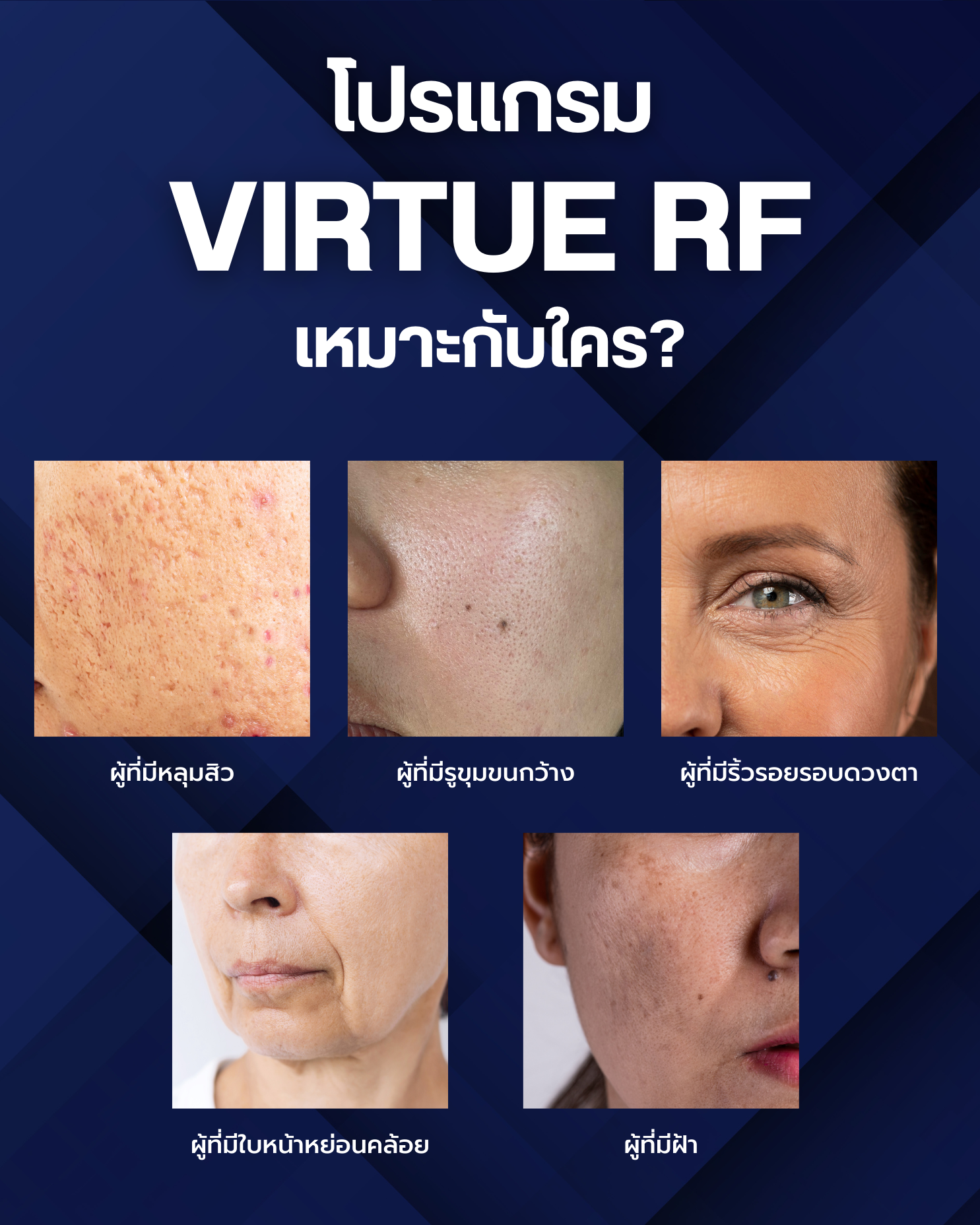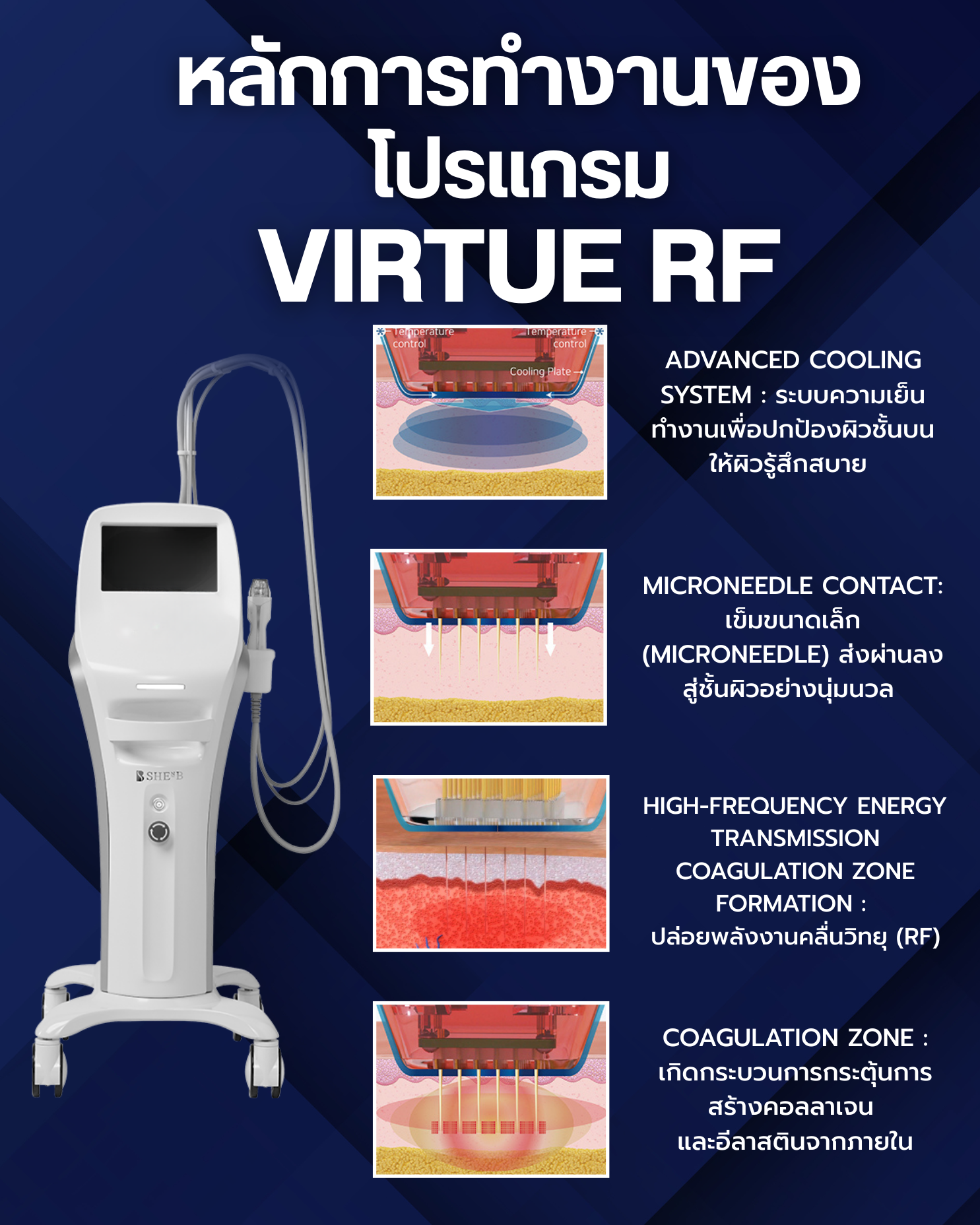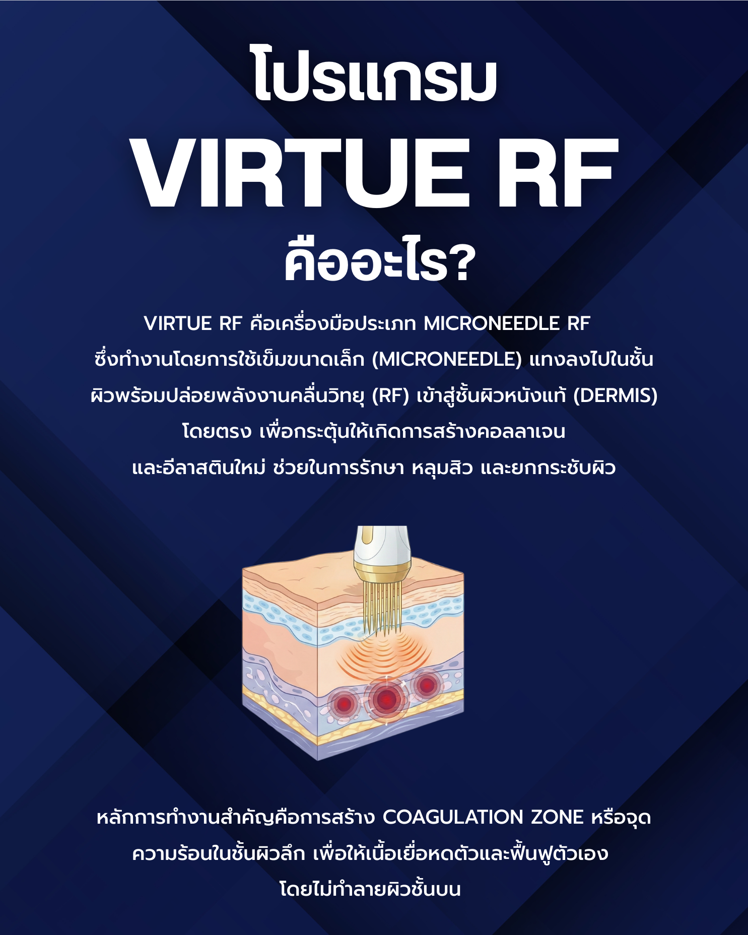 โปรแกรม Virtue RF คือเครื่องมือแพทย์มาตรฐาน (US FDA, KFDA, CE) ที่ใช้เทคโนโลยีคลื่นวิทยุ (Radio Frequency) ส่งผ่านเข็มขนาดเล็ก (Microneedle) ลงสู่ชั้นผิวลึก โดยมีจุดเด่นคือการกระตุ้นการสร้างคอลลาเจนและอีลาสตินใหม่ เพื่อซ่อมแซมผิวที่เสียหาย หลักการทำงานคือ ตัวเครื่องจะปล่อยพลังงาน RF ลงไปเกิดความร้อนในชั้นผิวหนังแท้ (Dermis) ทำให้เกิดกระบวนการ Coagulation Zone หรือการหดตัวของเนื้อเยื่อ ซึ่งเปรียบเสมือนการฟื้นฟูโครงสร้างผิวใหม่จากภายใน ทำให้ หลุมสิว ตื้นขึ้นและผิวกระชับขึ้นอย่างเห็นได้ชัด