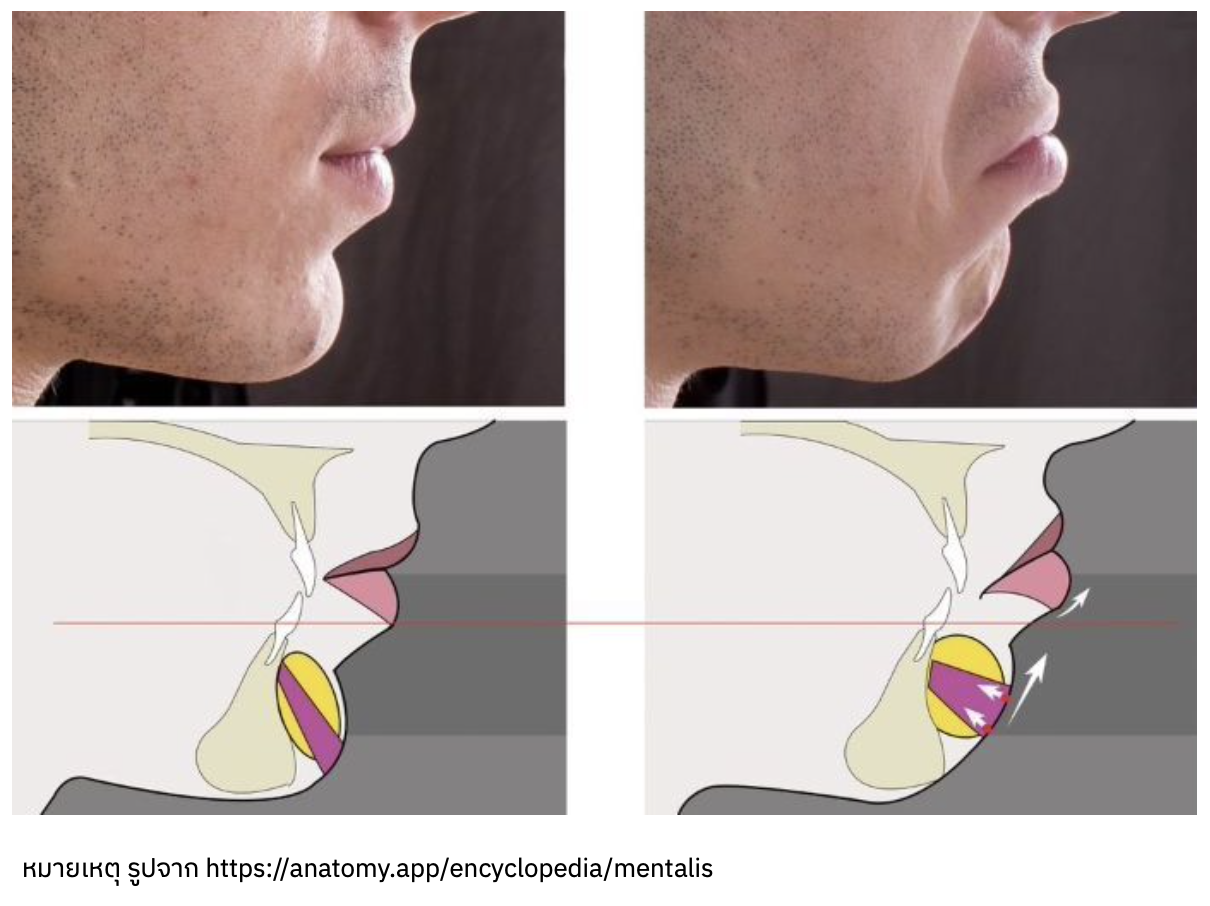 รอยย่นรอยบุ๋มที่คาง เกิดจากล้ามเนื้อ Mentalis muscle กล้ามเนื้อบริเวณคาง ซึ่งเมื่อเราแสดงสีหน้า กล้ามเนื้อบริเวณนี้จะทำการยึดผิวหนังส่วนคางเข้าไป ทำให้เกิดรอยย่น รอยบุ๋มบริเวณคางได้