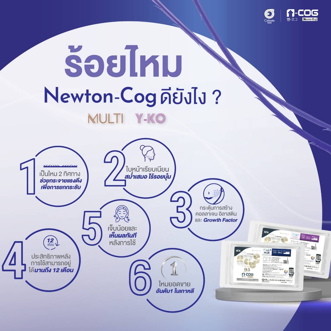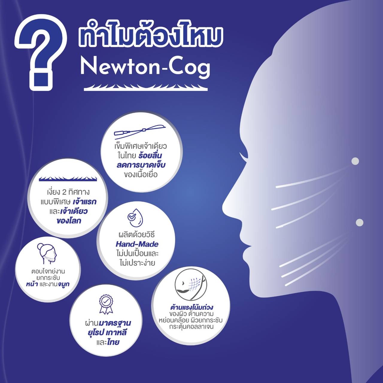 Newton-Cog จาก N-FINDERS นวัตกรรมการป้องกันผิวจากความหย่อนคล้อยด้วยเทคนิคกระจายแรงดึงทั่วทั้งเส้น ไหมออกแบบเพื่อต้านแรงโน้มถ่วงของผิว ผ่านการศึกษาและงานวิจัยทางคลินิกได้รับการยอมรับอย่างมาก คิดค้นโดยผู้นำด้านเทคโนโลยีการร้อยไหมระดับโลก สามารถป้องกันผิวจากความหย่อนคล้อย ฟื้นฟู และเติมเต็มคอลลาเจนของใบหน้า